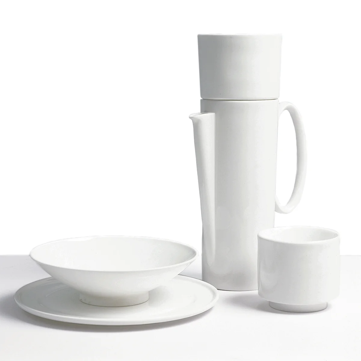 Breakfast set Carte Blanche made out Bone China porcelain for Babylon manufactured in Stoke-on-Trent. The coffee filter cone can be both used for the coffee pot as well as for the mug. Carte Blanche has been included in the permanent collection of the Victoria and Albert Museum in London.